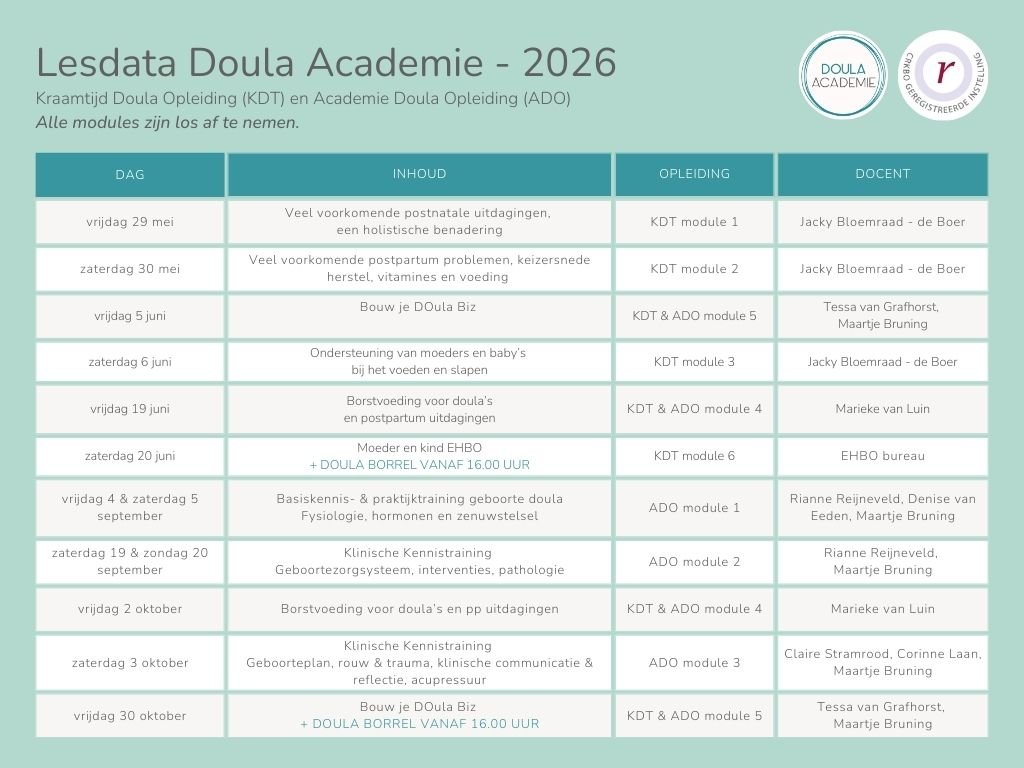 - Inleveren businessplan uiterlijk eind november 2026 (als je de complete Academie Doula opleiding volgt)